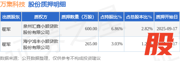 证券之星消息,万集科技(300552)9月19日公开信息显示,股东翟军向泉州汇鑫小额贷款股份有限公司、海宁鸿丰小额贷款股份有限公司合计质押865.0万股,占总股本4.06%。质押详情见下表: